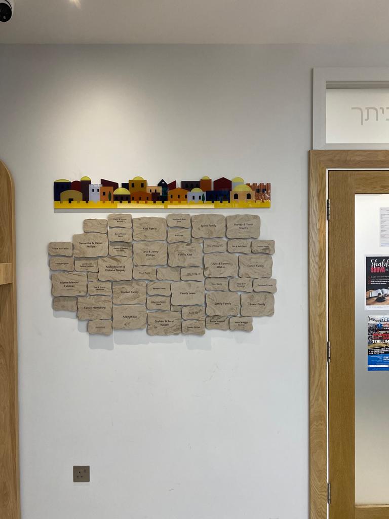 Jerusalem stone wall built around a custom hand painted mural of Jerusalem. Individual sandblasted Jerusalem stone plaques in multiple sizes differentiate recognition levels.