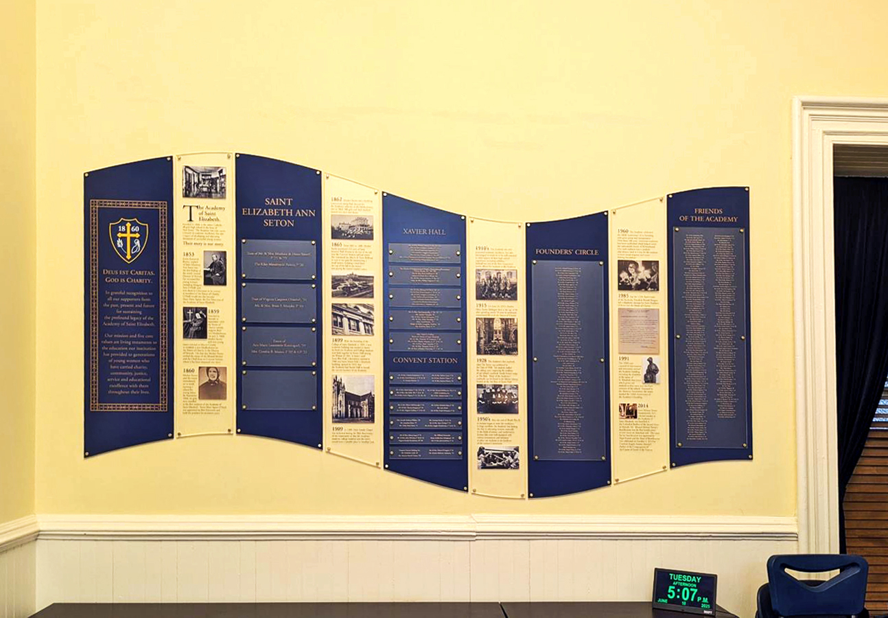 Multiple sized 3/8” acrylic plaques have light grey sprayed on the backs. The text is printed on the faces in dark grey. The plaques float ½” from the wall. Aluminum rosettes cover the mounting hardware. 2 bottom plaques are fabricated from satin aluminum laminated to acrylic. Individual aluminum letters, sprayed grey, title the wall. They are flanked by printed acrylic logos.