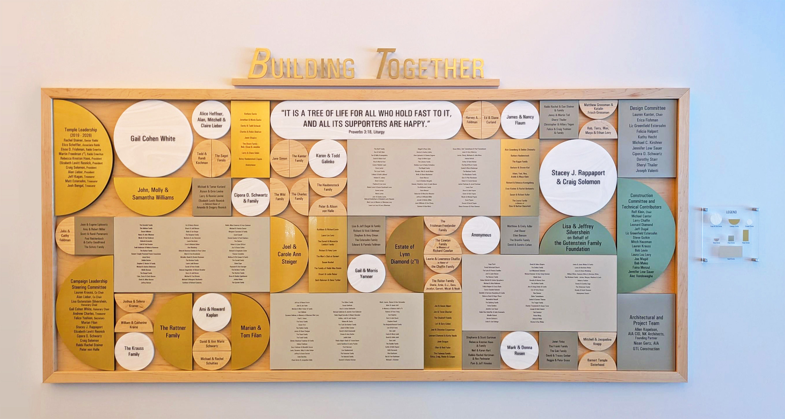 A magnificent multi-elevational, maple wood wall accommodates Glacier Ice Corian plates. Donor names are engraved in dark grey. Plate sizes differentiate donor levels. Individual Corian letters and the UJA logo title the display. The design allows for easy installation of future donor plates.