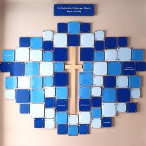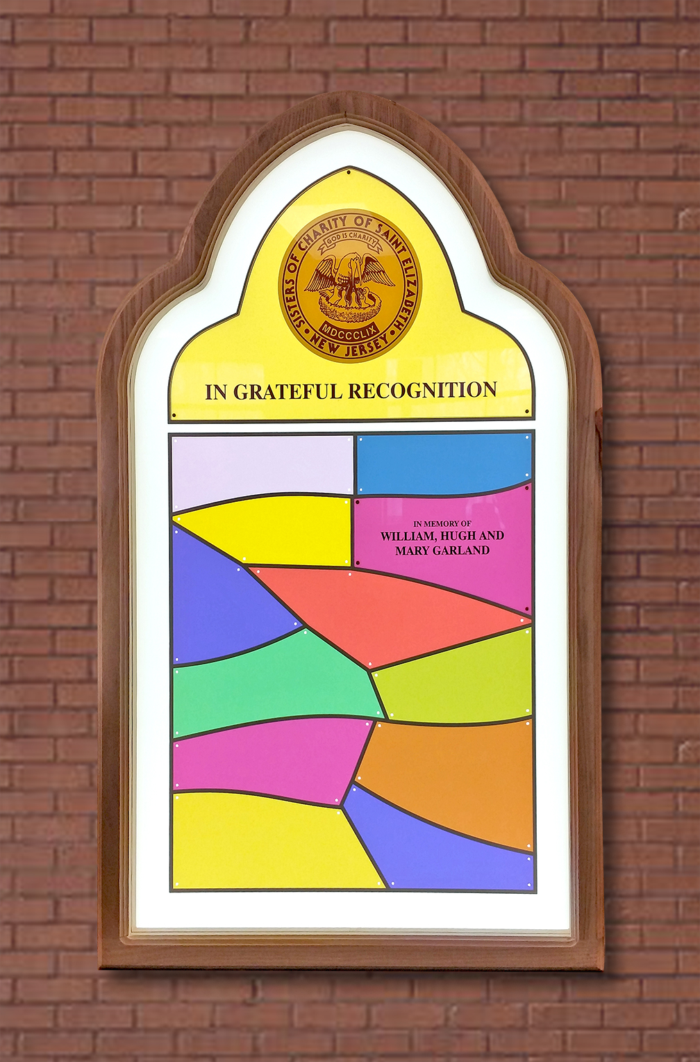 This majestic, custom designed Capital Campaign Donor Wall has names printed on 2 - 35” x 47 ½” satin brass plaques mounted to a ¾” mahogany background. Smooth, tapered mahogany columns with Tuscan bases and caps support a 5” deep mahogany soffit with crown molding. Down lighting illuminates the brass plaques. Glass mosaic images of Saints are installed in the alcoves between the columns. The base of the unit is 12” x 5” deep Black Absolute Granite with gold filled sandblasted letters and a logo. The overall size is approximately 6’ x 20’.