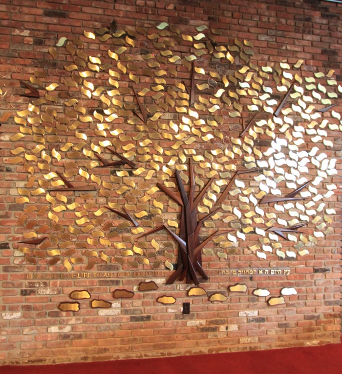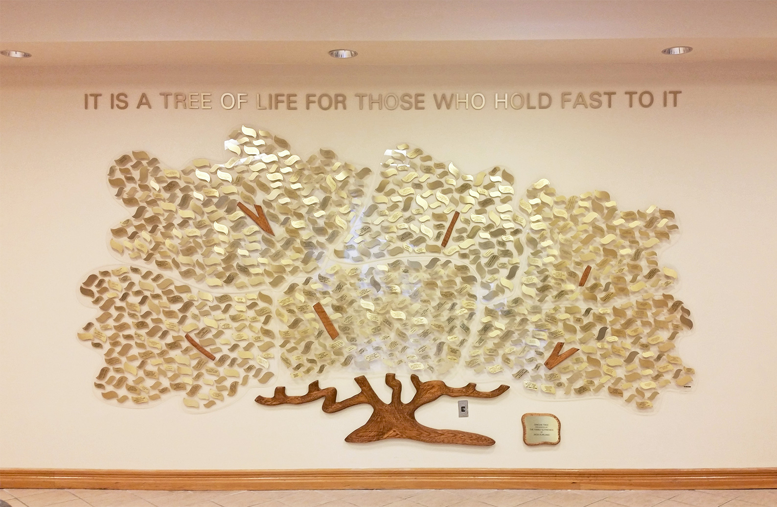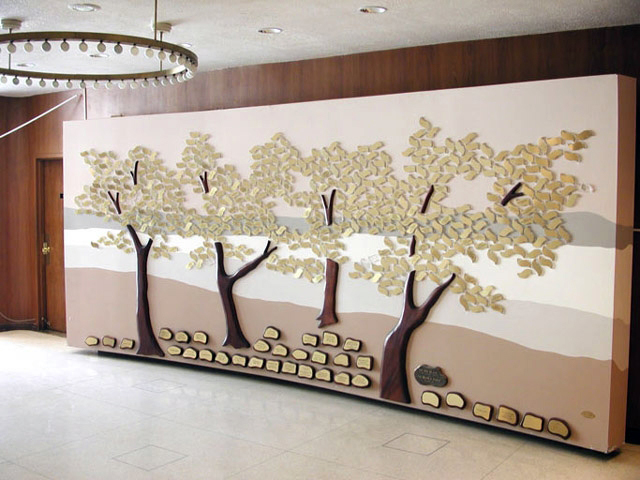 150- 1 ½”x 4” oval acrylic leaves painted white, dark blue, light blue, and grey are mounted to 3/8” clear acrylic leaves. 5 acrylic doves painted white recognize large donations. The multi-layered hand-carved base and branches are cherry stained cherry. 4”, 3”, and 2” individual aluminum letters painted dark blue title the wall. The children's silhouettes and blades of grass are ¼” acrylic painted dark blue.