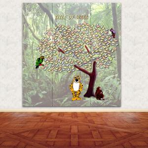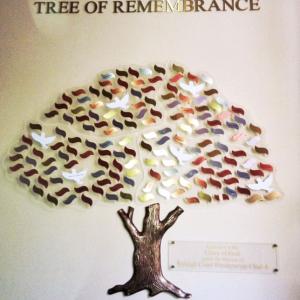 150 - 1 1/2" x 3 1/2" leaves, (85 copper, 50 aluminum and 15 brass), and 6 – white aluminum doves are mounted onto 1/4" clear multi elevational Plexiglas islands. The base is sculptured bronze. Individual 3” satin brass title letters are mounted to the wall