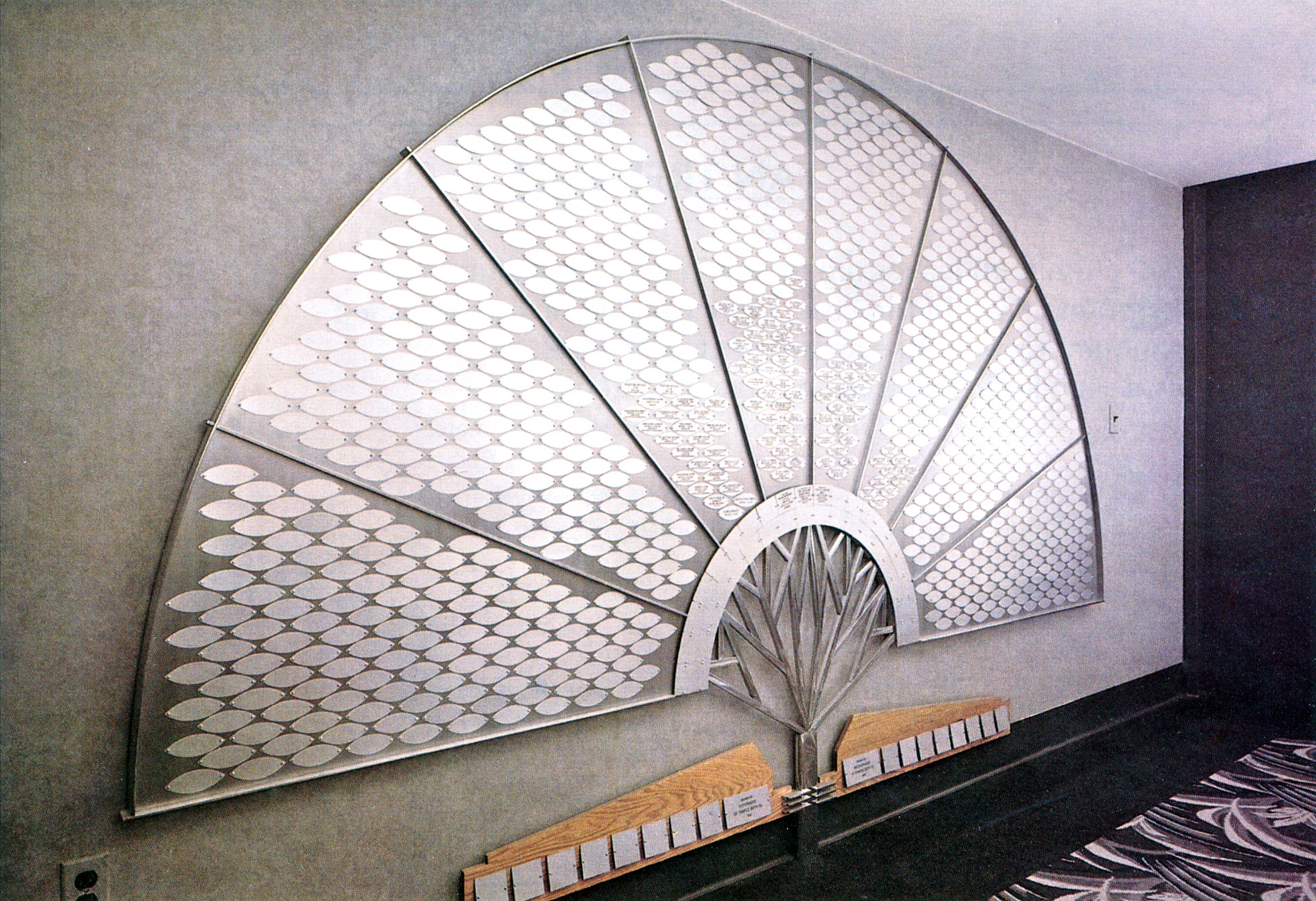 Aluminum leaves mounted to satin aluminum background with aluminum divider bars, larger donors are recognized on the bottom donor plates of this Fan donor recognition tree.